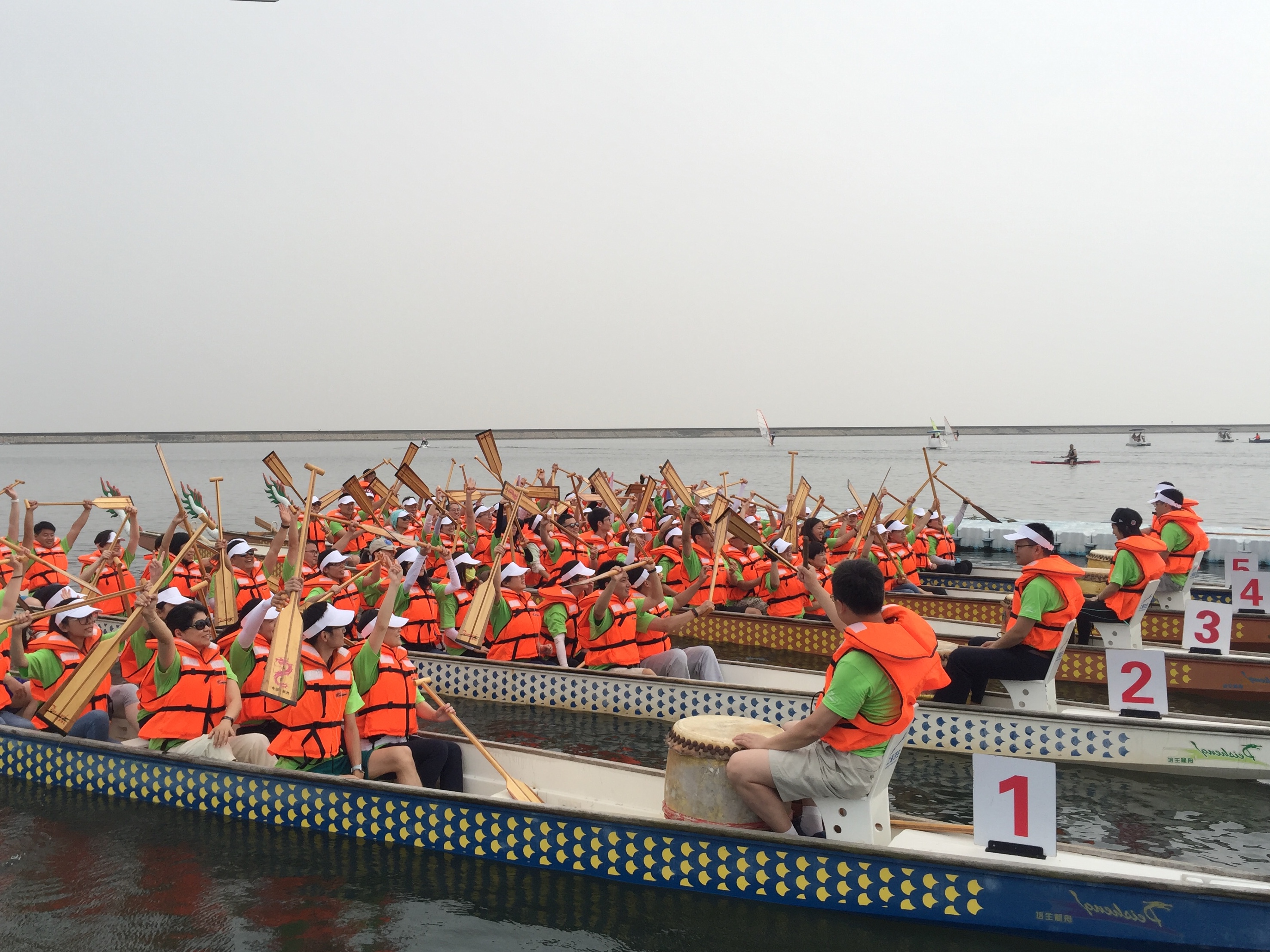 五支龙舟队迅速组队完毕,随即在教练的带动下做集体热身操。龙舟比赛中,团队默契协作至为重要,因此,活动开始是这样一个环节,各队根据主题合作完成绘画和涂彩,最后组合成一幅龙舟一跃、江上逐浪的巨幅画卷。 午餐后龙舟比赛正式开始。本次龙舟赛分预决赛两轮,预赛为胜者进入决赛,最终前三名胜出。参赛的大部分队员是新手,经过教练关于握浆、入水、拉手、移浆等动作的最基础的讲解和自我演练后,进入正式比赛。